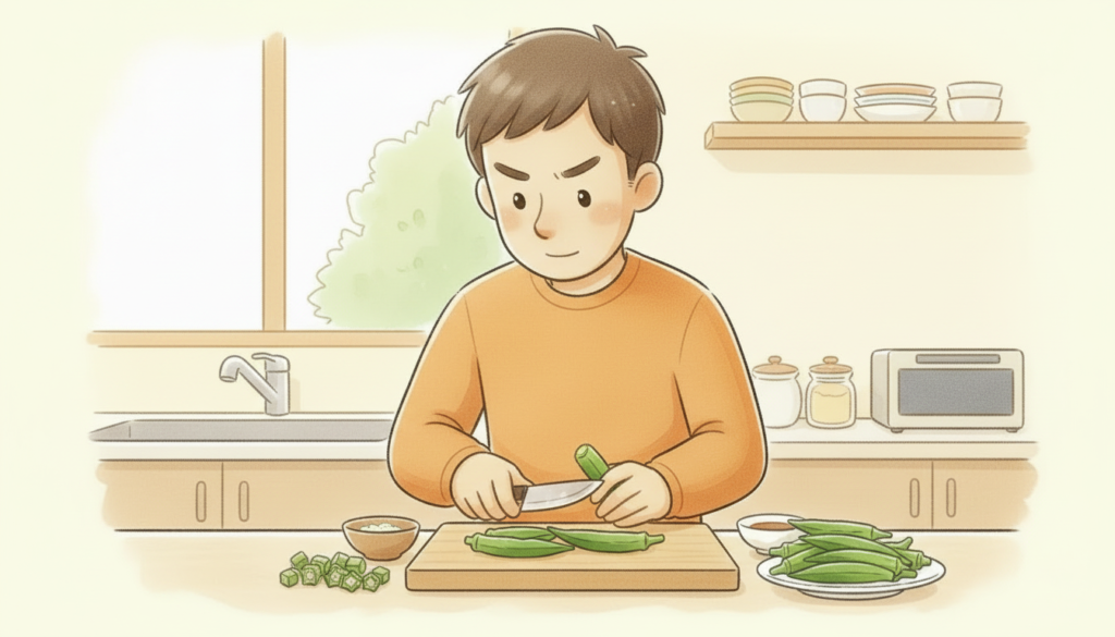 「オクラって、塩で揉んで産毛を取るんだ…」